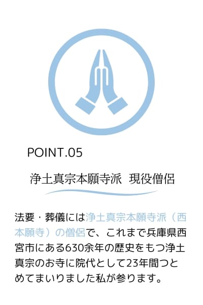 浄土真宗本願寺派(西本願寺)の僧侶であり、これまで兵庫県西宮市にある630余年の歴史をもつ浄土真宗のお寺に院代として23年間つとめてまいりました。