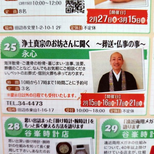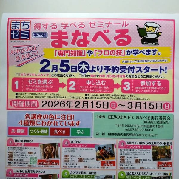 第25回「まちゼミまなべる」スタートします 2026 2/06 お知らせ 2026年2月6日 2026年2月15日~3月15日まで、田辺のまちゼミ「まなべる」が開催されます。永心は、2月15日・16日・17日・21日に開催いたします。上記日程以外でも受付いたしておりますので、お気軽にご相談下さい。 お知らせ よかったらシェアしてね! URLをコピーしました! URLをコピーしました!